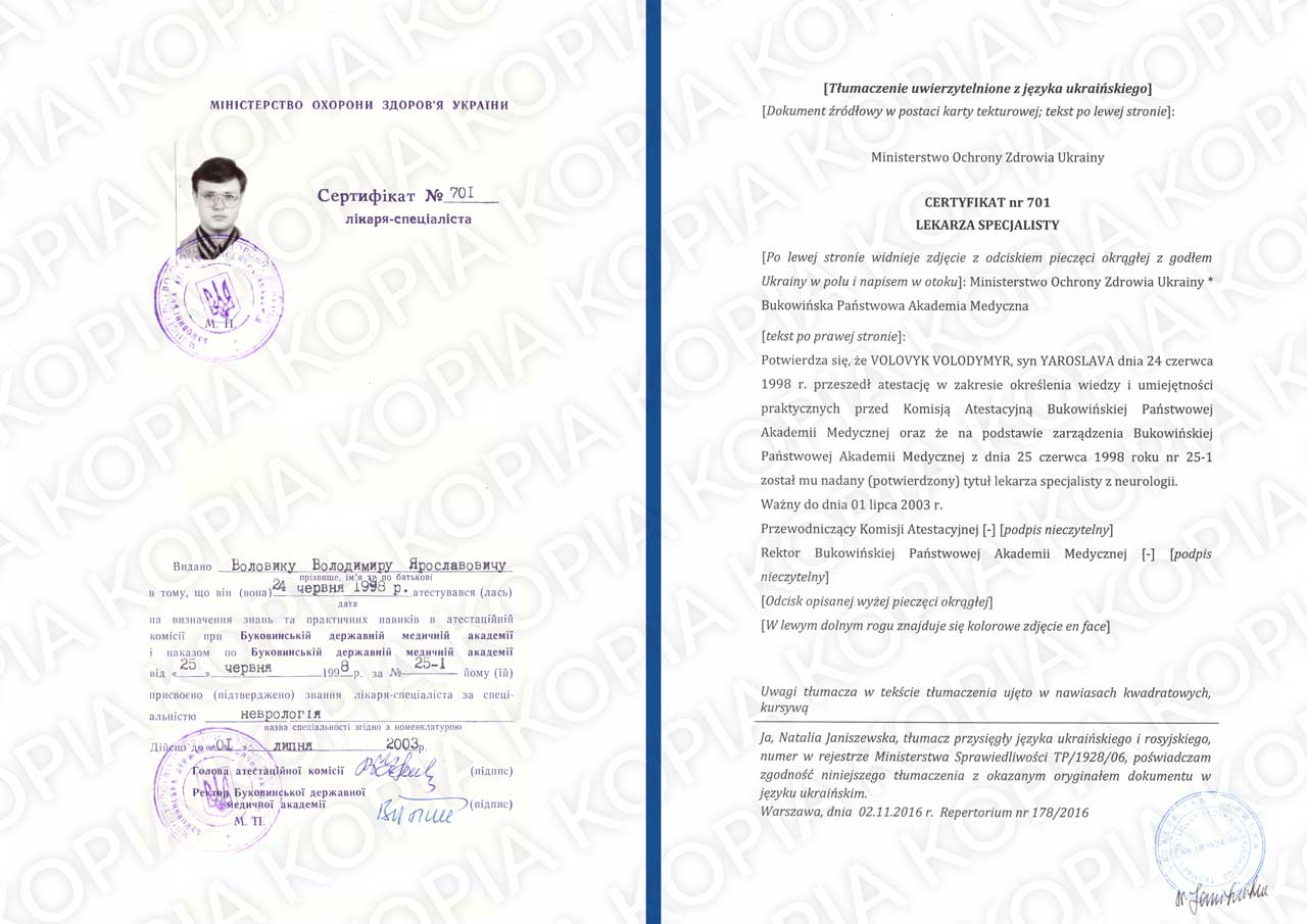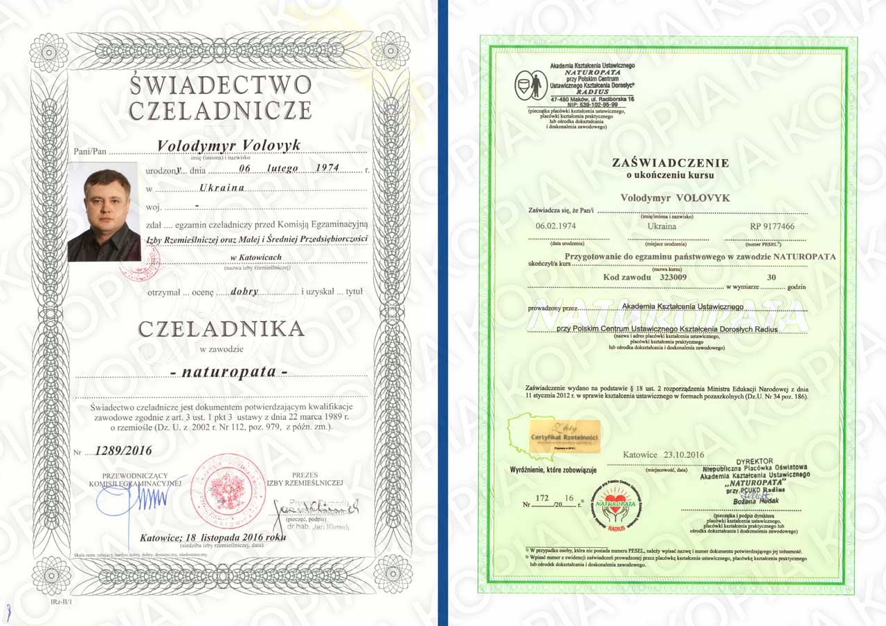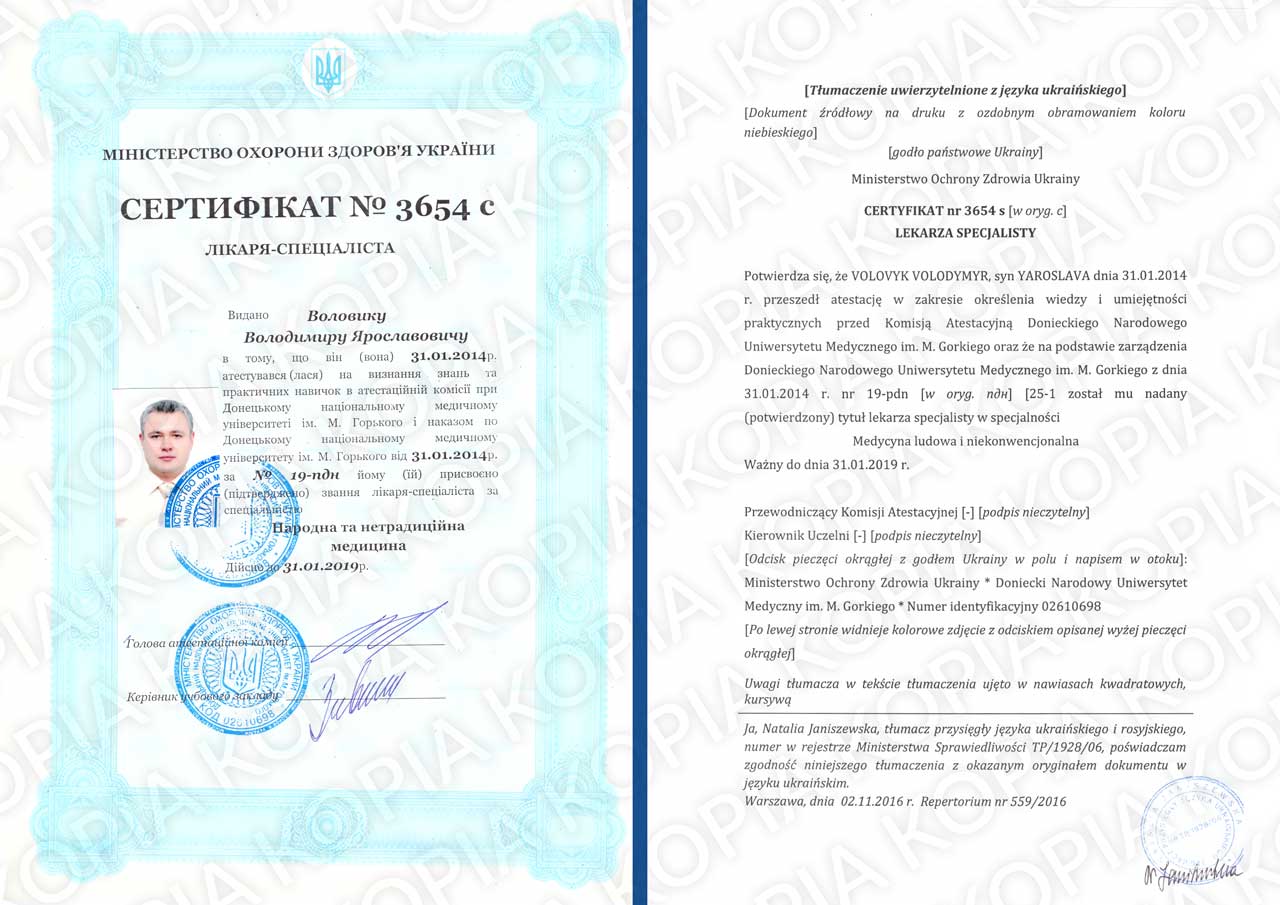 - w 1997 roku ukończyłem Bukowińską Państwową Akademie Medyczną specjalizacji: lekarz – neurolog oraz drugą specjalizacją – lekarz medycyny niekonwencjonalnej.